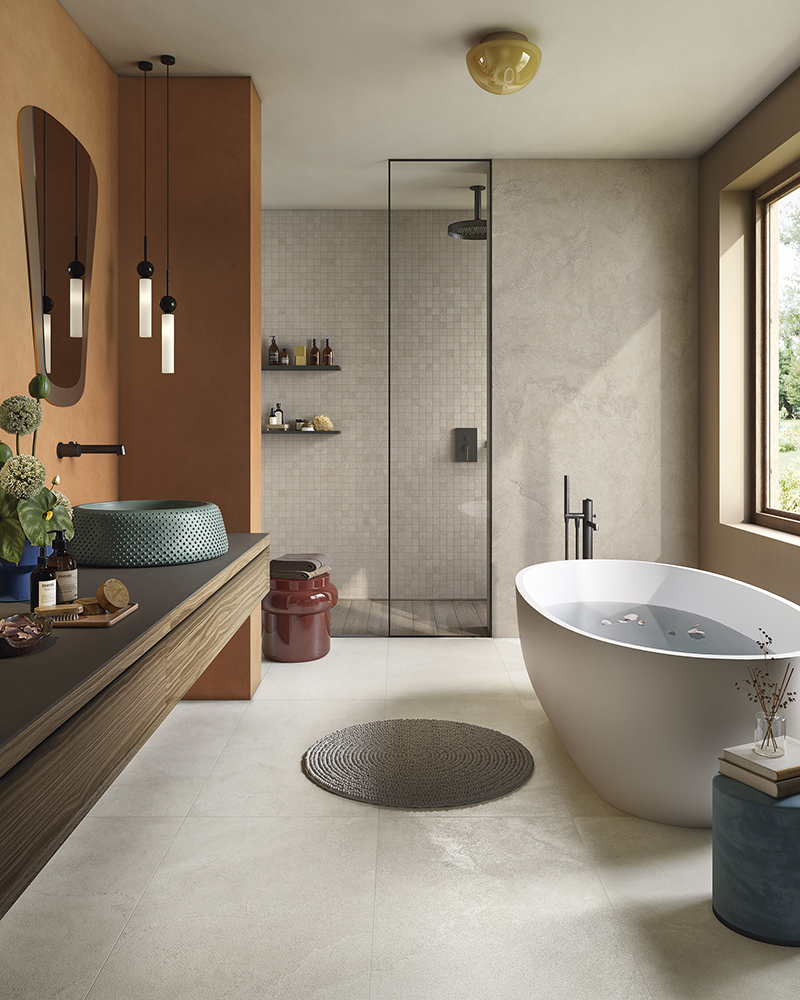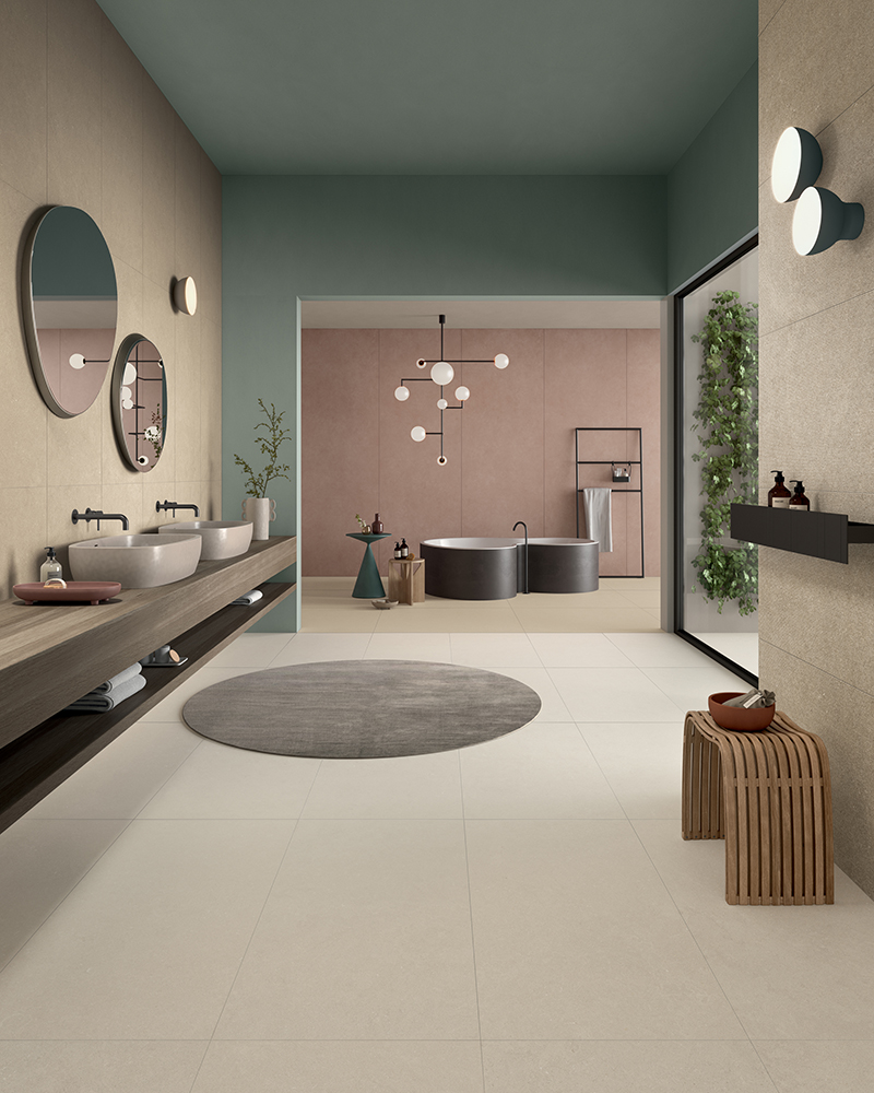 The collection is the ideal choice for bathrooms in dialogue with the outdoors, thanks to its material essence and its ability to harmonize effortlessly with other styles. Particularly striking is the combination with the marble-like elegance of Slimtech Noblesse, for instance as a cladding for furnishings.
