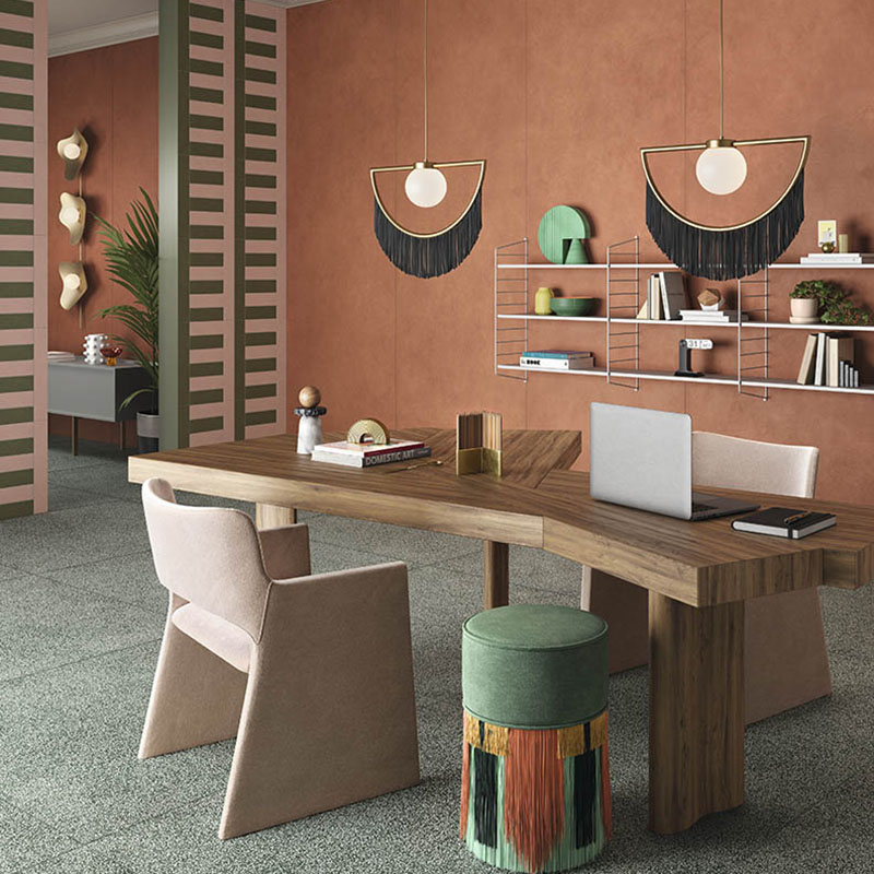 Fruit of the same collaboration, Masterpiece blends cement and natural stone to create a surface that is both industrial and elegant. Its sophisticated tones – ranging from sandy beige to graphite greys and warmer hues – provide the perfect foundation on which to build structured colour compositions, where each block of colour contributes to a harmonious and striking vision.