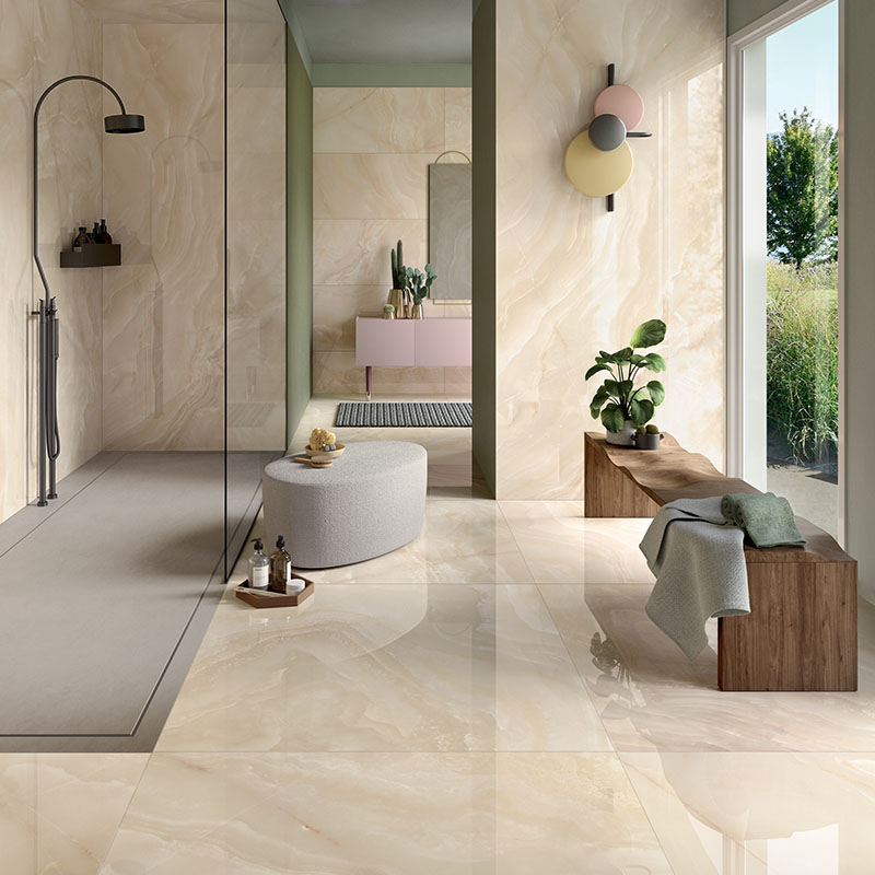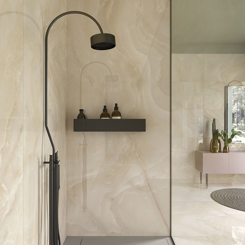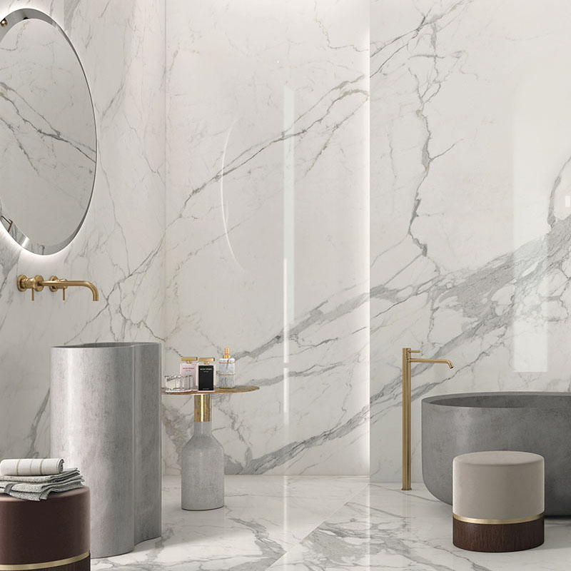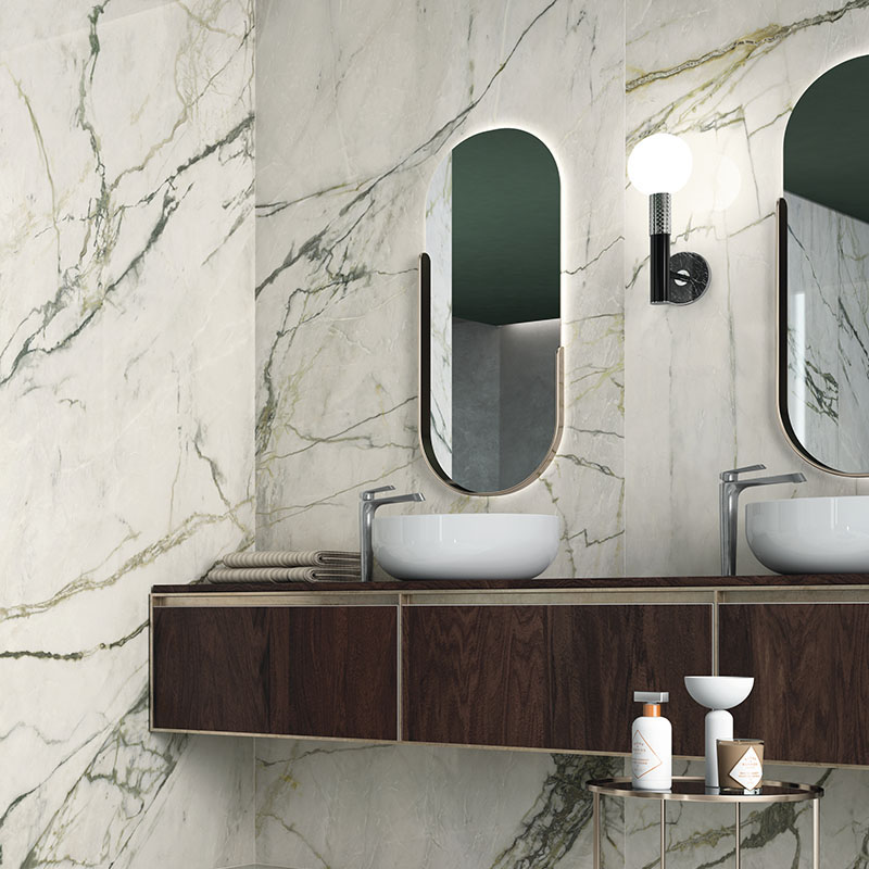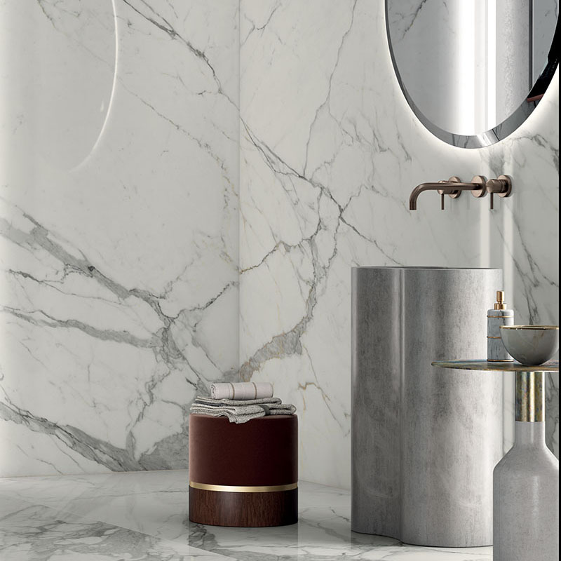 When discussing marble-look bathroom tiles, another important aspect to consider is thickness. Due to its chemical-physical composition, natural marble cannot be cut into overly thin slabs as this would compromise its strength. A natural marble cladding, therefore, would be unattractively thick, especially if used for low cladding. Porcelain stoneware, however, makes it possible to minimise the thickness of this element, especially if one opts for laminated stoneware, which comes in over-sized slabs that are just a few millimetres thick (generally between 3 mm and 6 mm). Obviously, this does not compromise the durability of the material. On the contrary, from this point of view, its technical performance far surpasses that of natural materials as it is waterproof, fire-proof, and resistant to acids, scratches, and most commercial cleaners.