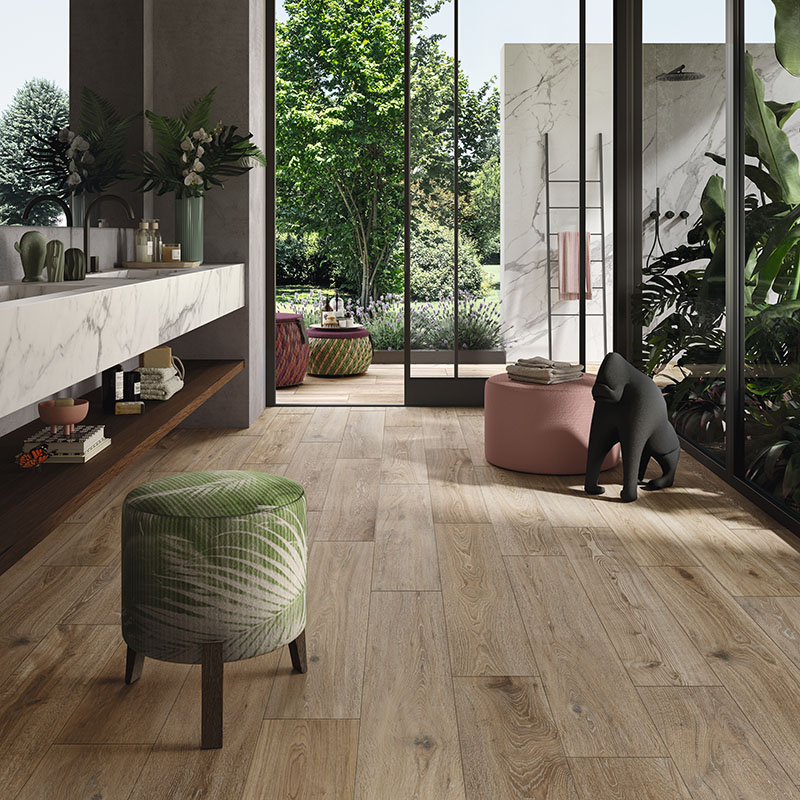 How do you create a marble and wood-look bathroom that fully captures the spirit of these two materials? One option is to use wood-look porcelain stoneware on the floor, creating a warm and inviting base. Meanwhile, the marble-look porcelain stoneware should be used for cladding the shower or the wall behind the bathtub, in elegant contrast to the floor. Thanks to ultra-thin porcelain stoneware you can even add a wood-look vanity top or sink to match the flooring. Finally, you could choose to pair similar colours of marble and wood, to create a more harmonious atmosphere, or go with a stronger contrast, for a more dynamic look.