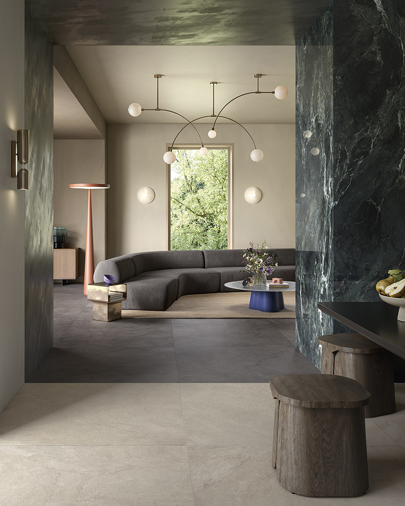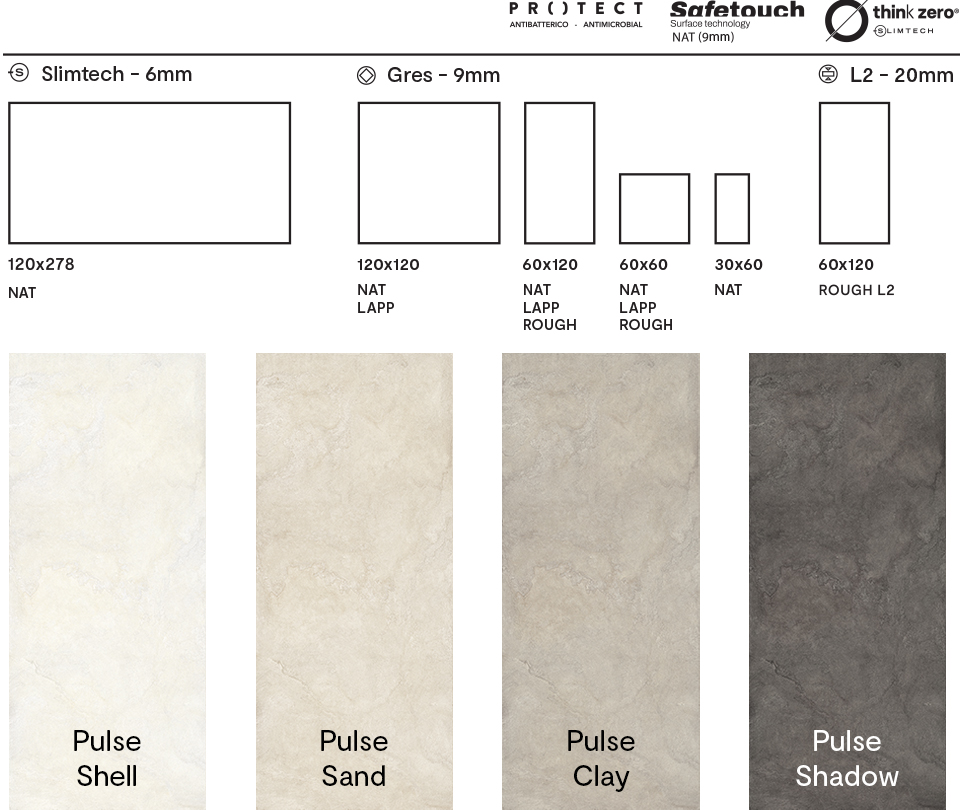 Four contemporary shades – Pulse Clay, Pulse Shell, Pulse Sand, and Pulse Shadow – available in finishes ranging from the Nat version with Safetouch technology, soft to the touch yet anti-slip, to the more pronounced and textured Rough variant, and the luminous, velvety Lapp versions.