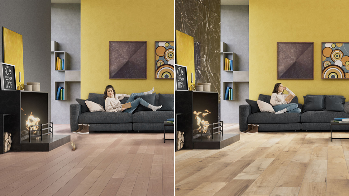 Heat may seriously affect the surface coverings in your home, resulting in dimensional changes and an uneven surface. If for example you leave a candle or a plastic object exposed to direct sunlight behind a closed window in summer, it will deform permanently as the temperature rises above a certain level. But because ceramic is fired at 1200°C, it can easily withstand even the highest temperatures that may occur in an interior, maintaining its original surface flatness and dimensions.