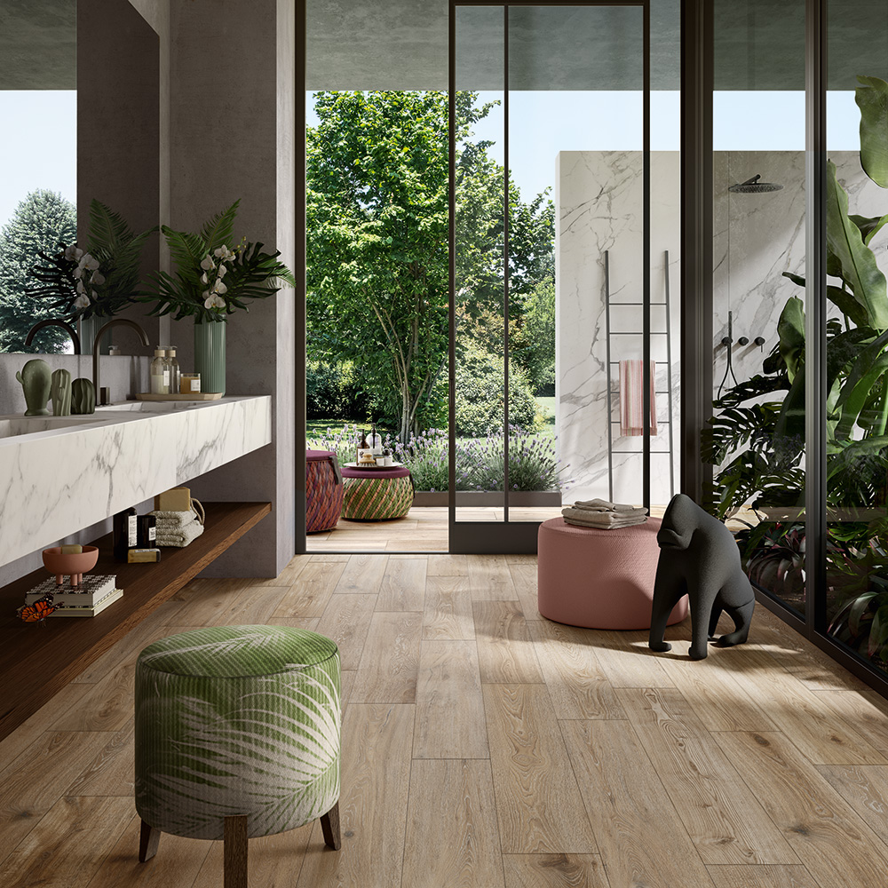Bio Attitude recreates the warmth of wood in a modern, versatile, and sustainable surface. Natural hues and delicate veining make it perfect for well-balanced and relaxing environments. A collection designed for those who seek harmony, authenticity, and beauty on a daily basis.