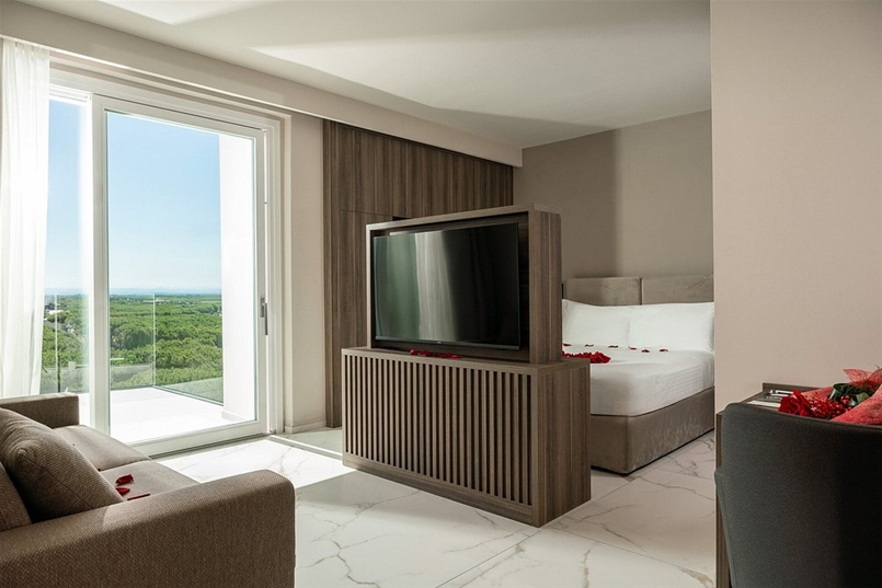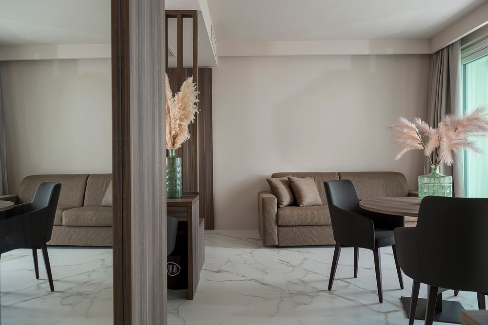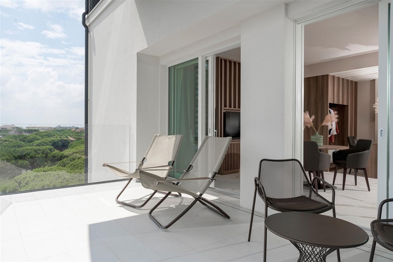 The balconies of the suites, on the other hand, are finished with the Masterpiece – Master White natural collection, completing the ensemble with an essential and contemporary tone, in harmony with the sinuous lines of the façades. In every environment, the Lea Ceramiche surfaces become an integral part of the architecture: a dialogue between design and technology that transforms the space into an experience of timeless well-being and beauty.