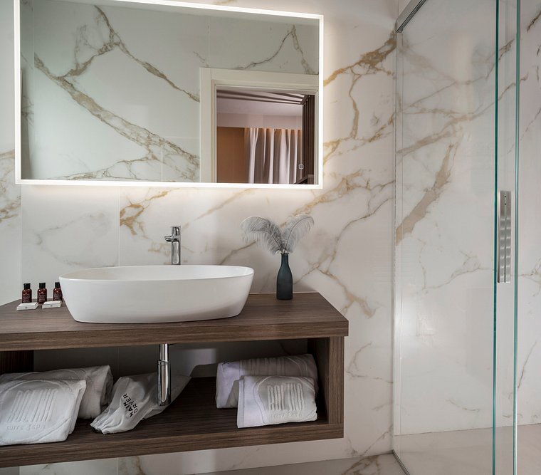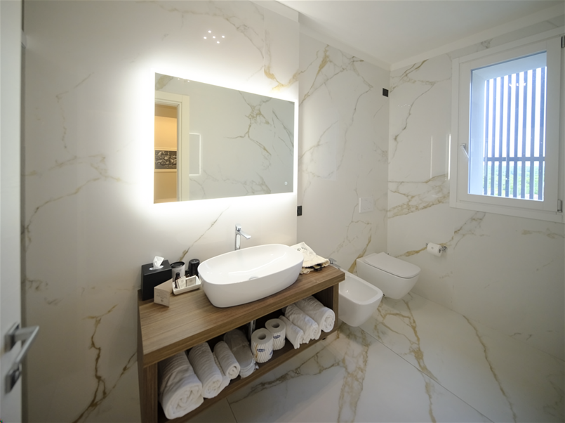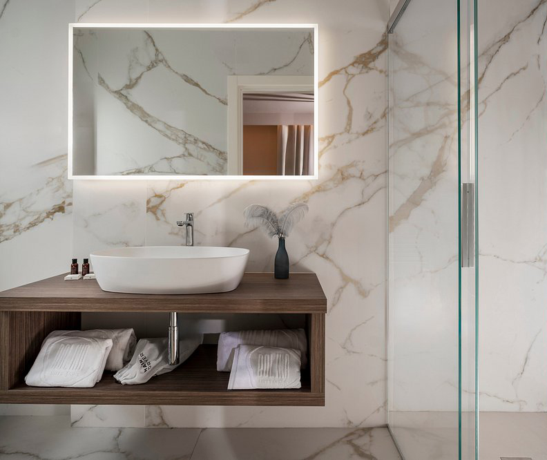 The Lea Ceramiche surfaces define the material and sensory character of the project, accompanying each environment with textures and finishes chosen to express elegance, coherence and comfort. Indoors, the suites and bathrooms feature the Noblesse – Calacatta Oro collection, used in the natural version for floors and the polished version for wall coverings: a luminous and sophisticated ceramic marble that amplifies the perception of space and the quality of light.