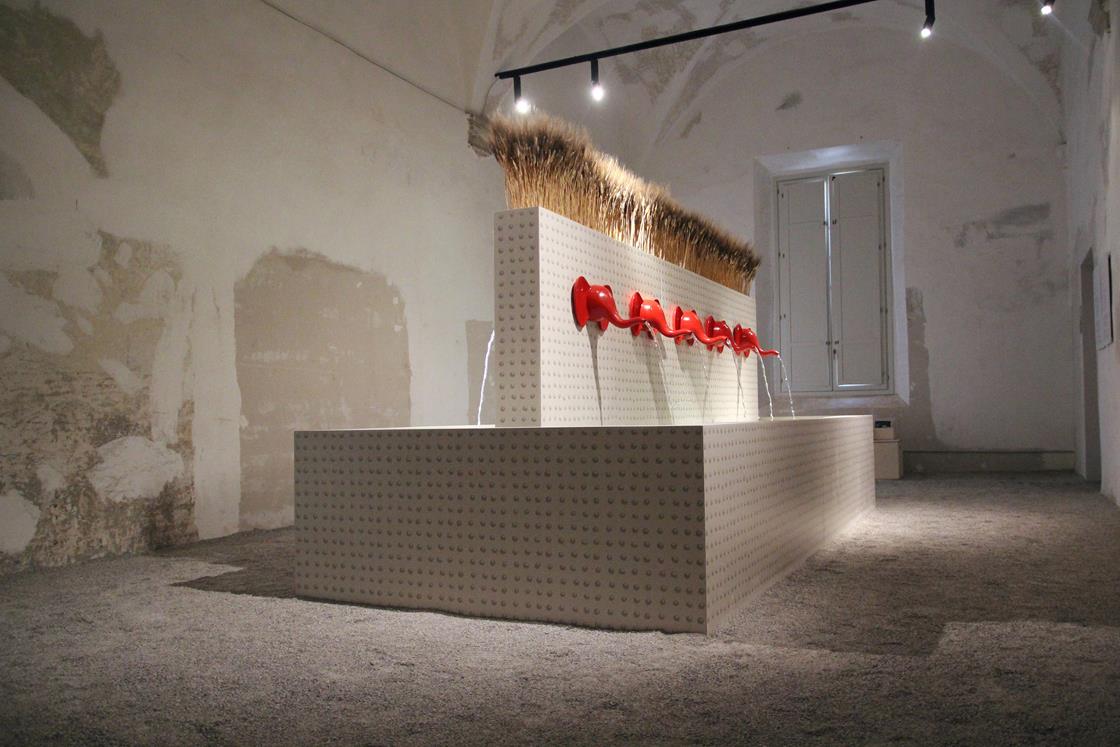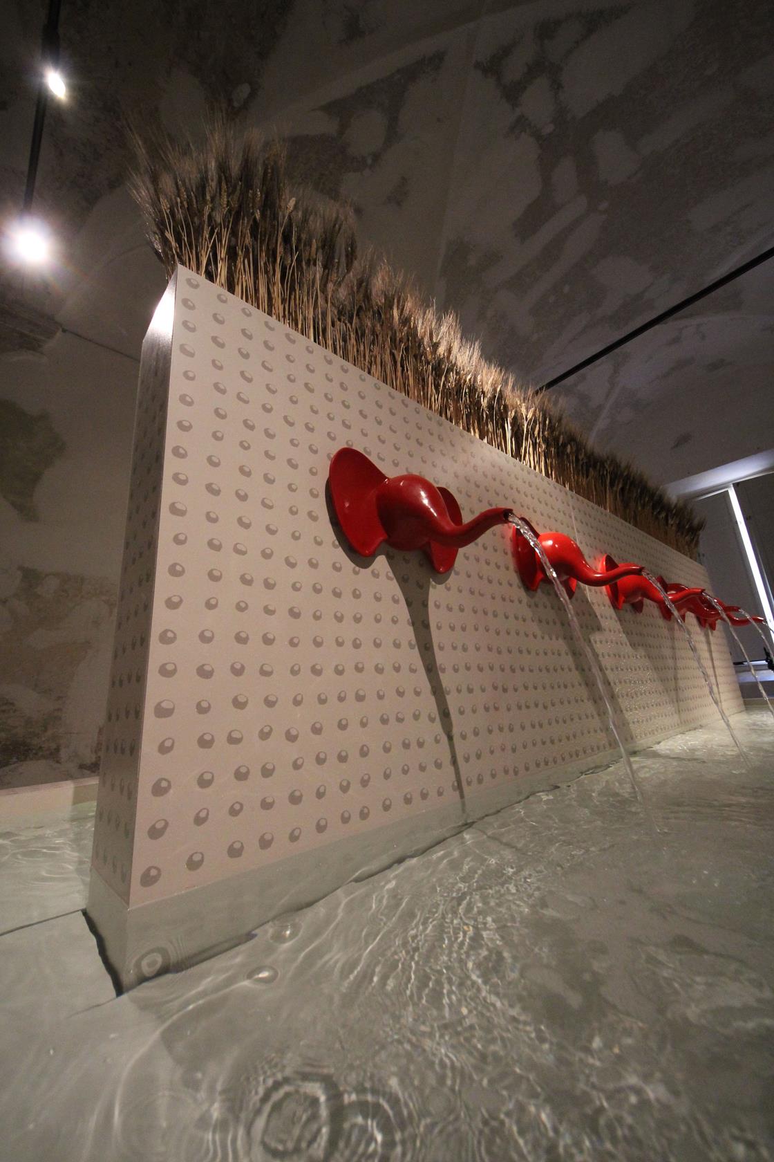 The setting is a beautiful hall with vaults overlooking the sixteenth century cloister of the Ospedale dei Bastardini in Bologna. Elephountain is a large fountain/sculpture consisting of a tank (approx. 4.60x2x2m) inside which there is a vertical wall on the two faces of which 10 elephant heads made of glazed ceramic are fixed (5 on each side).