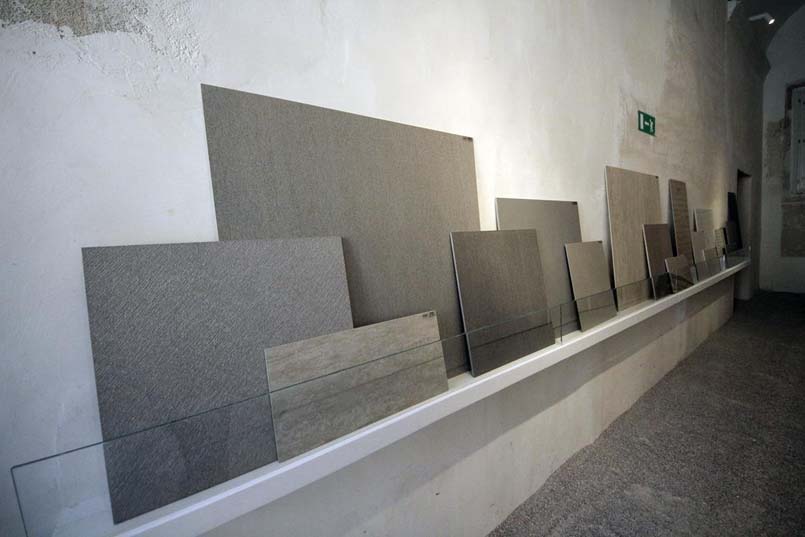 The entire floor of the room is covered with a thin layer of sand to represent the origin of ceramic material. Luceplan fixtures light up the fountain and the panels with a few touches of warm light that highlight the quality of the materials in an almost theatrical atmosphere. As a whole, this installation may be a demonstration of how these new materials can represent new possibilities for a variety of applications, in this case, for a joyful, poetic creation.