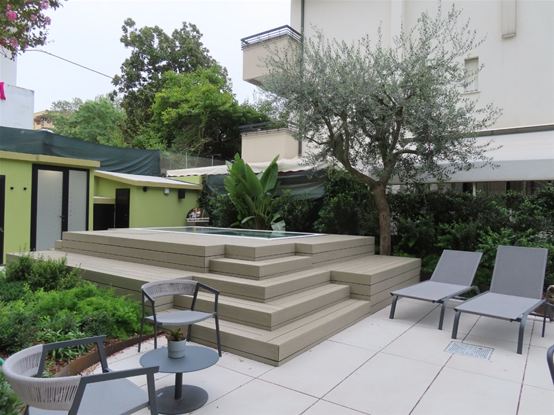 Inside the MODE Eco Mood Hotel in Rimini, a project that experiments with new models of sustainable hospitality through the contribution of several Italian architecture firms, outdoor spaces represent a fundamental component of the hotel’s identity. Conceived as places for meeting and relating with the landscape, they define a natural continuity between architecture, greenery and well-being, transforming the outdoor area into a living and welcoming extension of the stay experience.