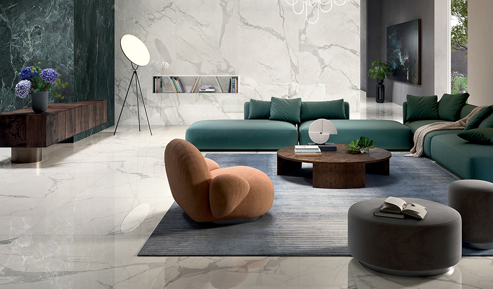 For the hall floor, the standout feature, in addition to the imposing reception desk, is the spectacular marble effect of Noblesse Calacatta Oro, laid in large 6 mm-thick slabs. The result is captivating, sophisticated, and refined. Perfect for an area designed to welcome visitors, who are received in a spacious setting with a focus on marble, a natural and ancient material, yet with a contemporary feel that is more in line with current tastes. Synonymous with technical strength and aesthetic excellence, Slimtech’s superior-quality thin ceramic slabs are therefore the key element and the distinctive feature of this space.