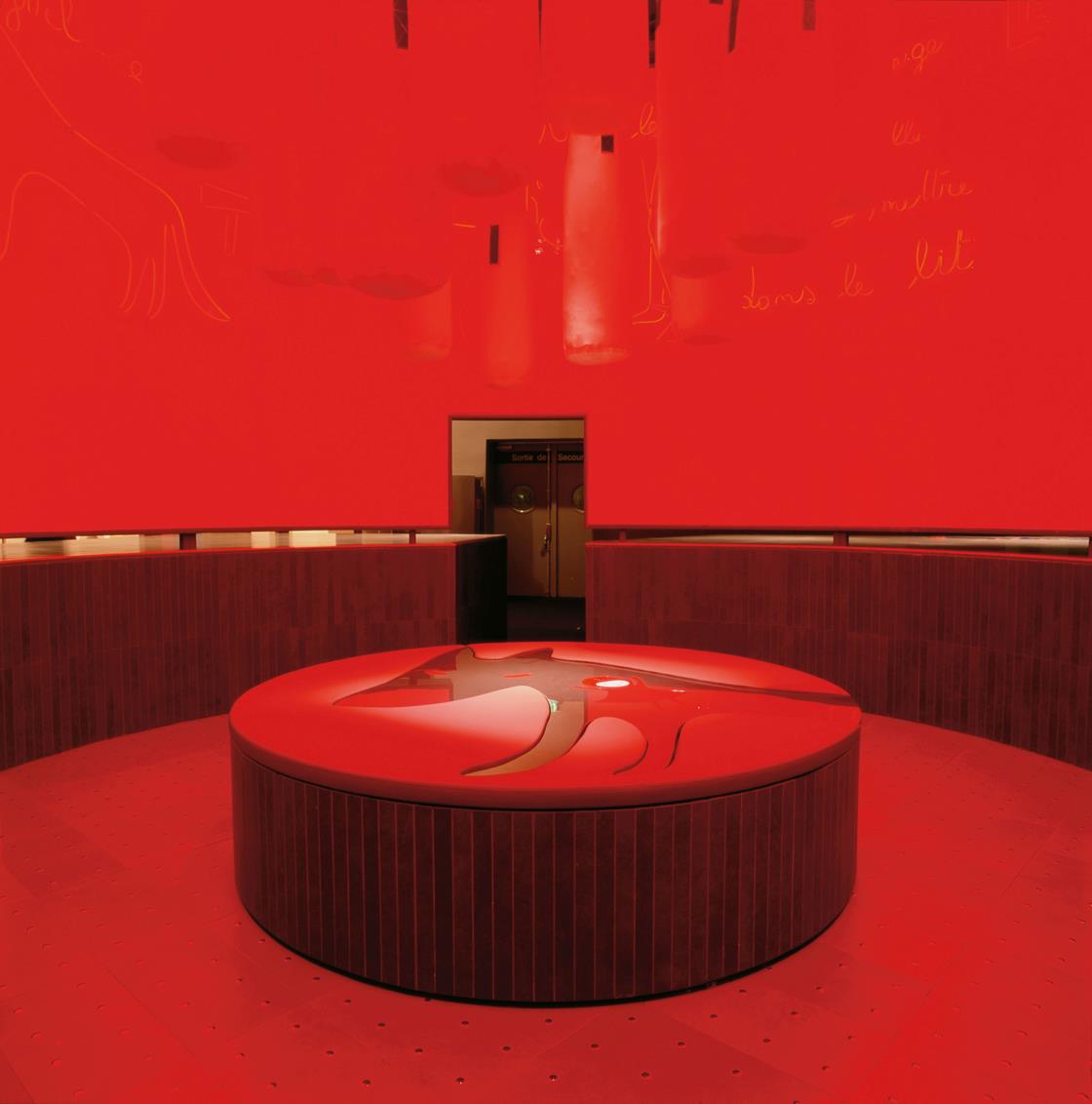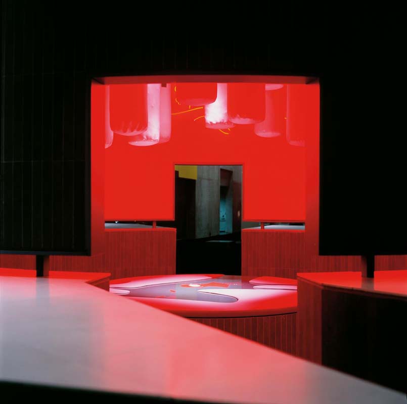 The project evolves around a cylindrical body, a sort of great magic lantern which is accessible through radial paths, in which some of the more important images of the tale are represented. From the outside, the space does not give away its true identity. The visitor, shy and yet attracted by the reassuring and captivating red light, is violently thrust into the circular space where memories, allegories and emotions create an exciting euphoric atmosphere and the desire to put on a mask (loup) in order to metaphorically act out their own fairy tale. Inside the space, entirely covered in ceramic material, a large, circular sofa in which the wolf’s silhouette is inscribed, welcomes the visitors; a series of boxing bags in white leather hang above the audience, inviting them to enter the ring and begin the game. Le Loup represented another stop in the path upon which Lea Ceramiche has embarked to create projects and events with important architectonic content and cultural beliefs in the creative and planning strength, still not completely expressed, of ceramic material.