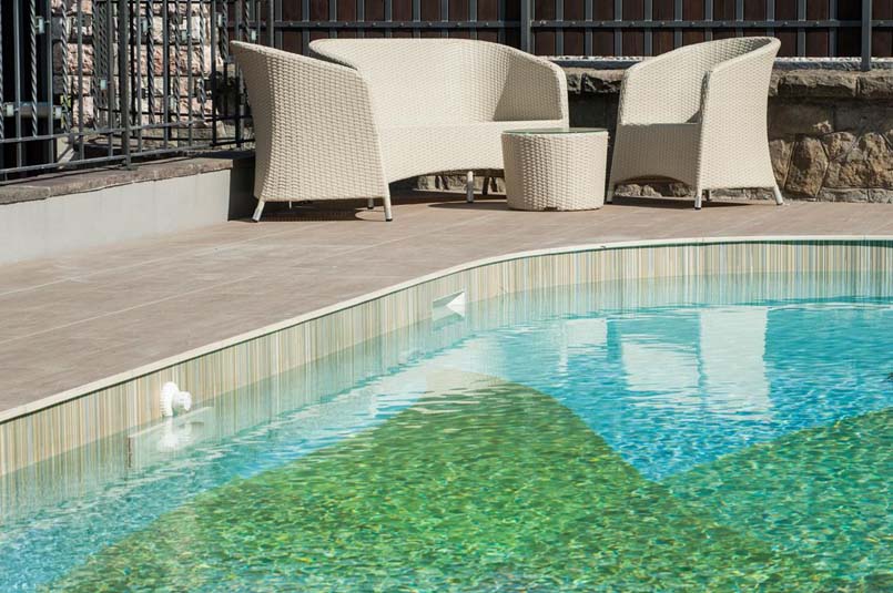 This was the starting idea that guided the homeowners in creating the swimming pool, a rectangular module adorned with a colorful and lively floral image.