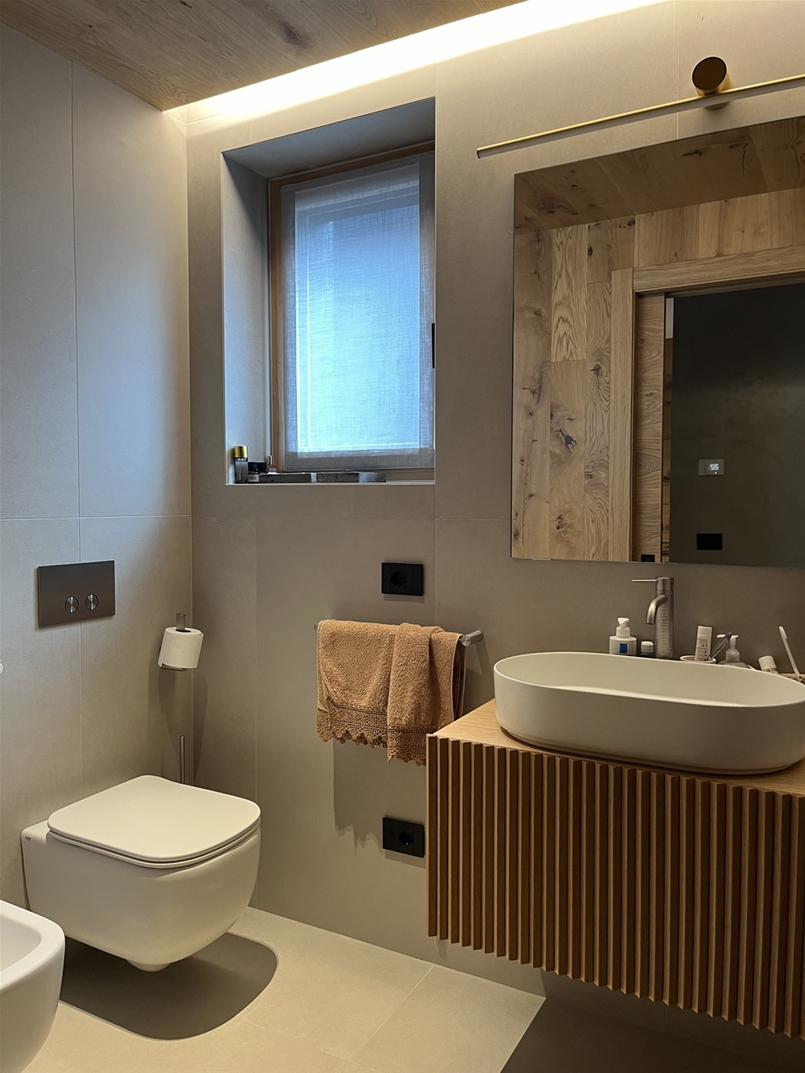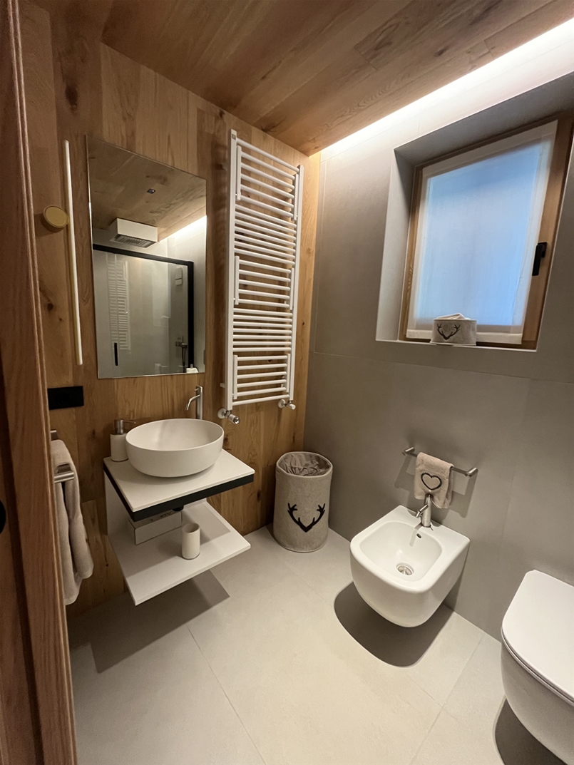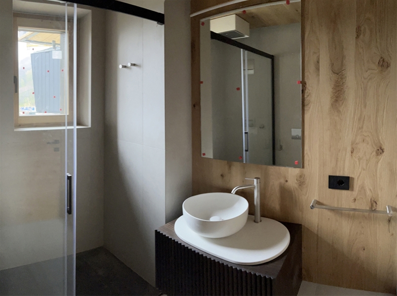 The architecture draws inspiration from high-altitude refuges and Walser settlements, but reinterprets them with an essential and contemporary language: large windows, wood and metal shape pure and luminous volumes, while the porcelain stoneware surfaces by Lea Ceramiche ensure aesthetics, resistance and safety in the most sensitive areas of contemporary living.