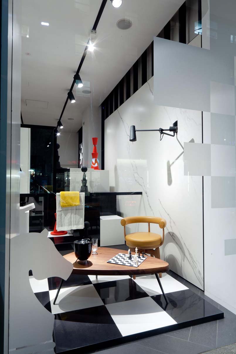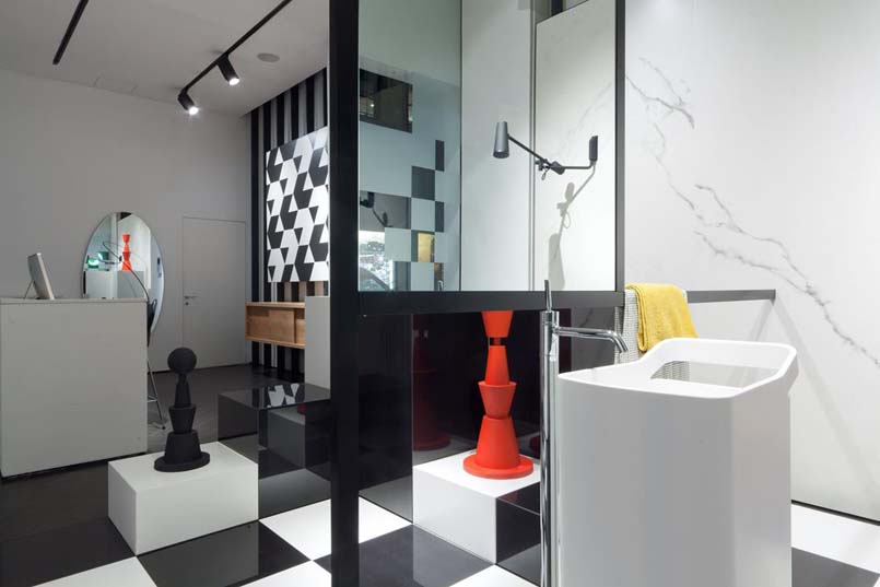 Designed by Diego Grandi, the space gives an ironic interpretation of a chess game, in which domestic environments interact with iconic furnishing and the new collections of Lea Ceramiche.