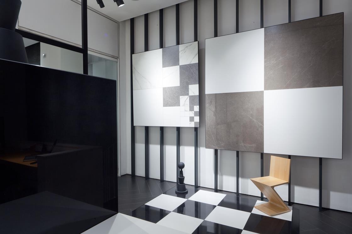 Scacco Matto (Check Mate) is the name given to the new showroom display in the Milan space of Lea Ceramiche, offering a panorama of the most recent products presented by the company from Modena.